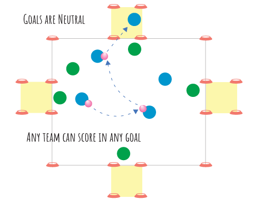 You can make all four goals neutral, so both teams can score in any of the goals.
