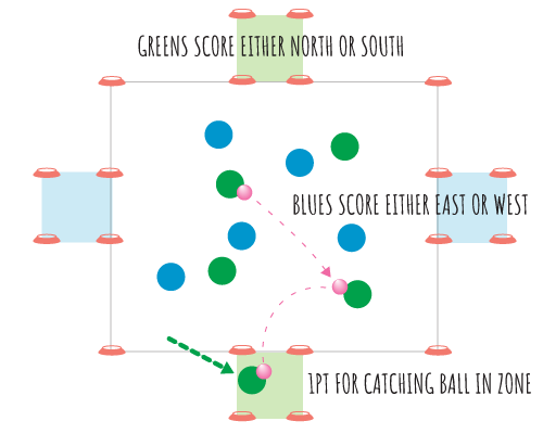 The objective of this game is for students on each team to score points by successfully passing the ball to a teammate positioned within one of their designated goal squares.
