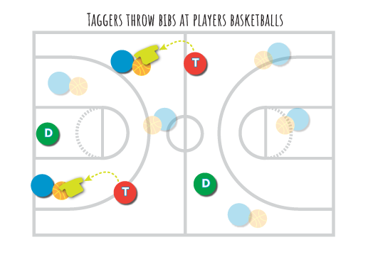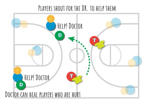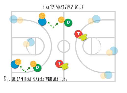 The taggers look to tag students by throwing their bibs onto a player’s basketball ball. If a student is tagged, they cannot move and shout out ‘Doctor. Doctor.’ A Doctor runs over to them to heal them. The Doctor must receive a bounce pass or thrown pass from the player, then make a bounce pass back to them. Once healed, the student can continue playing.