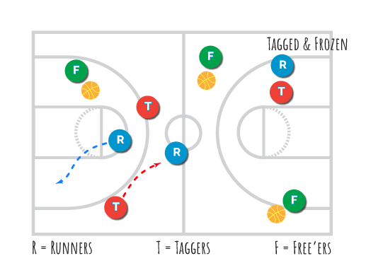 The Taggers try to tag ALL the Runners within a time limit. The Free’ers try to free the students who are tagged and unfreeze them by making a thrown or bounce pass.