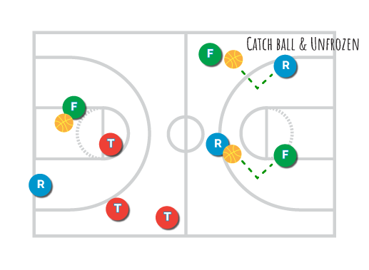 Free’ers – Run around dribbling the basketball and identify who has been tagged in the catching position. They throw their ball to the catcher or make a bounce pass, who must try and throw it back. The free’er then identifies a new player to release.