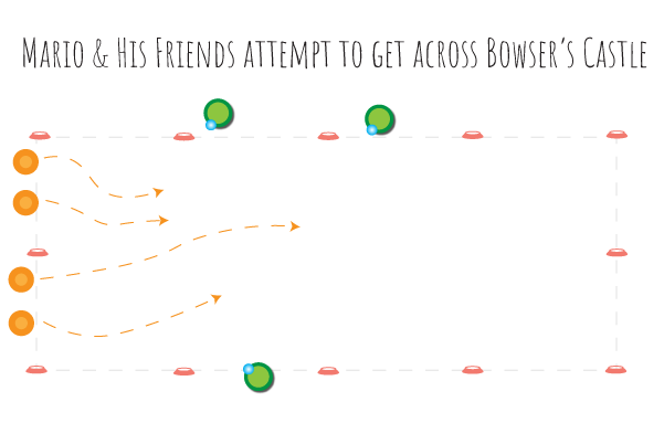 Start: Pick 2-3 students to be part of Bowser’s Army and take a position outside the cones before equipping them with a dodgeball.