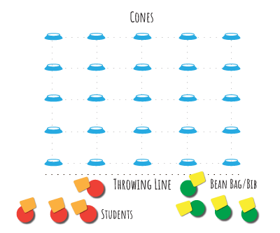 Turns: Teams take turns throwing one of their bean bags into any of the spaces between the cones.