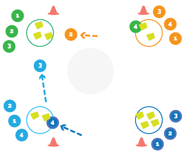 Arrange four hula hoops (Cookie Jar) as shown in the diagram. Place the beanbags in the middle between the cookie jars. Divide players into four teams and each team line up behind their assigned cookie jar.
