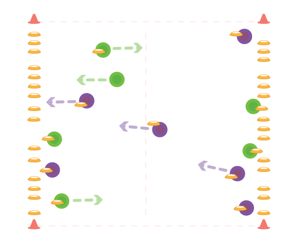 Create an area appropriate to the number of students. Use the bigger cones to outline the corners of the area. Place an equal number of discs along the end lines of the area.