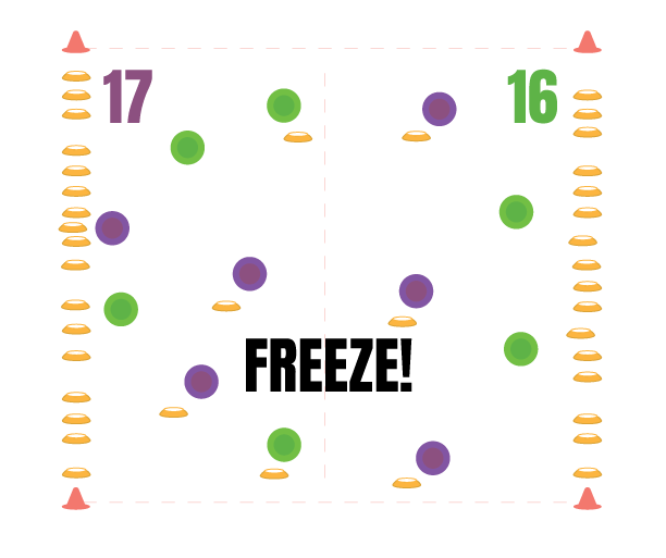 At the end of a specific time limit, for example, one minute. The coach commands FREEZE. The students stop, and if they have a disc, they drop it to the ground. The coach counts up how many discs are positioned on each end line—the team with the most wins.