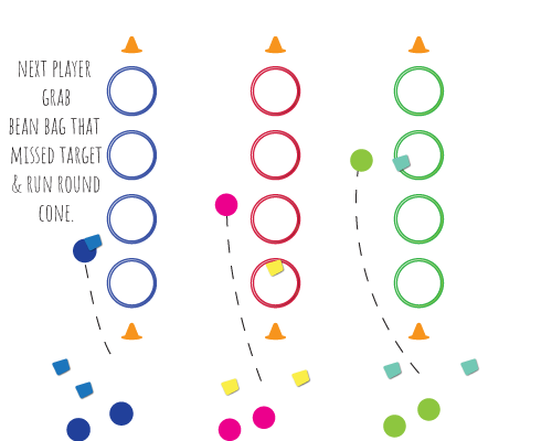 If they miss, the next person must grab the bean bag they missed and round around the cone before taking their shot.
