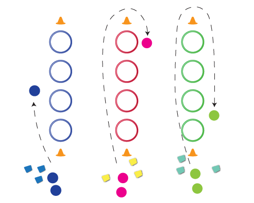 If they make it into a hoop, the bean bag stays in the hoop, and the next person in line is free to run around the cone and grab a bean bag from the pile before shooting.