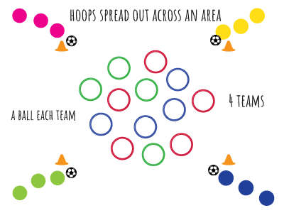 Students kick or roll the ball into hoops. If they score, they take the hoop back to their team. The team with the most hoops at the end wins.