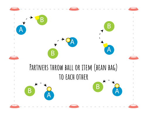 Player B starts with a ball or soft item (e.g., foam ball, bean bag, or bib).