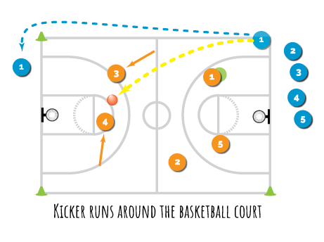 To get the kicker out, the outfield team has to get the ball and make a basket before the kicker runs all the way around to the last cone. They can score in any basket.