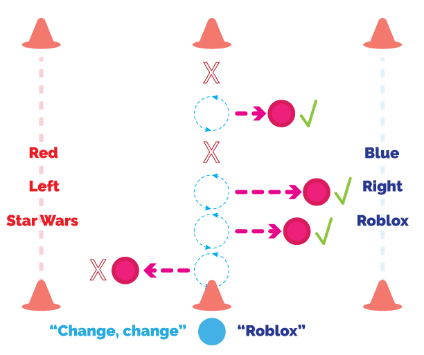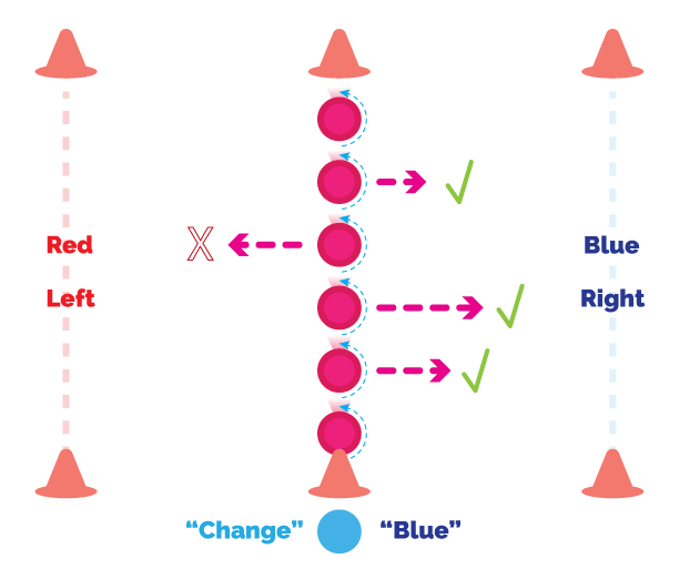 Place additional cones approximately 5 to 10 yards on either side. Each side is designated Left & Red, Right & Blue.
