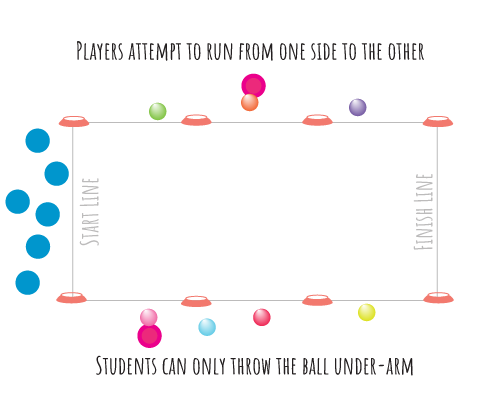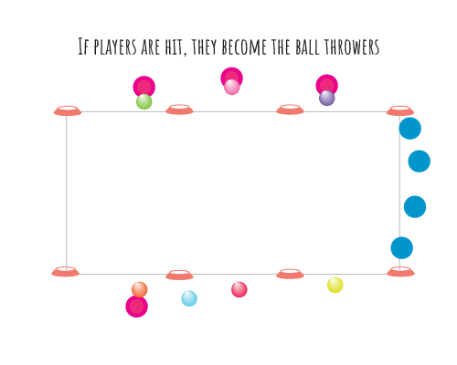 Create a rectangular playing area, and place dodgeballs along the length of both sides.
