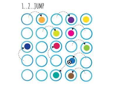 Create a 4x4/5x5 grid using hula hoops (or circular arrangements of cones) on a flat surface like blacktop or grass.