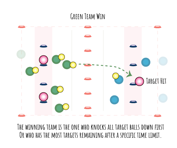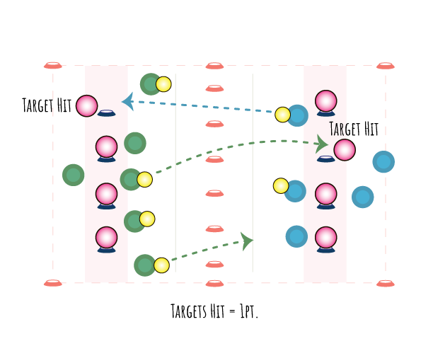 One player may guard each target ball. Cones and the target balls that are hit should be removed from the playing area.