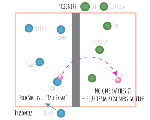 JAIL BREAK: If a player calls “Jail Break” and the ball lands on the ground on the opponent’s side, all their imprisoned teammates return to the game.
