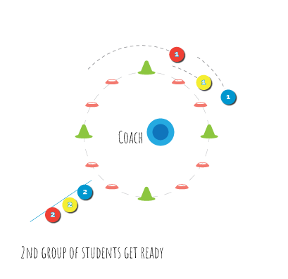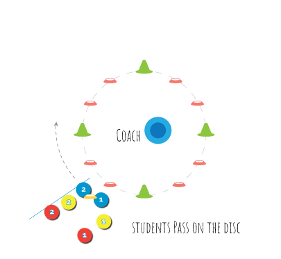 The 2nd student runs around the circle and repeats the sequence of passing a disc/cone to student 3.