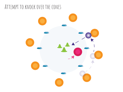 The objective is to move the ‘cannonball’ around the circle and strike the tower of cones in the middle.