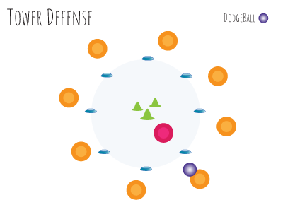 Tag Progression: If the tower defender tags the cannonball or an attacker holding it, that attacker is out and must recharge in a hula hoop for a time limit.