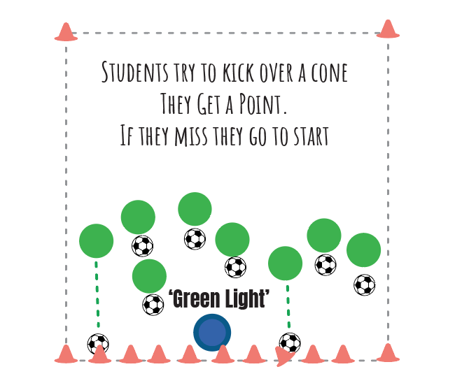 The first student to dribble close enough to the finish line and successfully knock over the cone with their ball wins! If they miss, they must go back to the start.