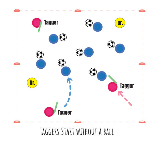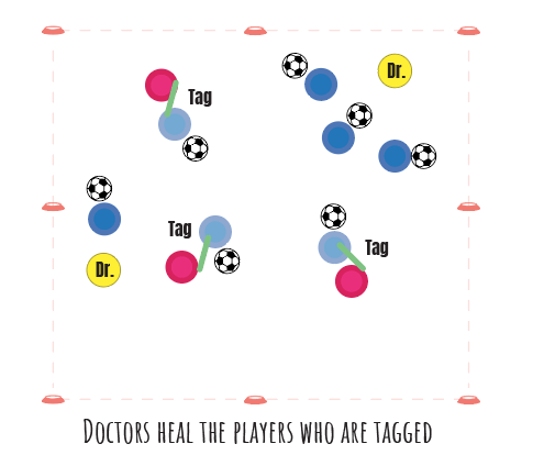To leave the hospital, a tagger must perform a soccer skill (e.g., 5 juggles, dribble around a cone).