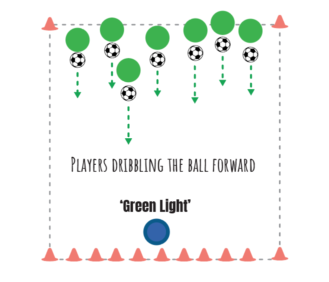 The instructor shouts, "Green Light!" Students start dribbling their balls forward.