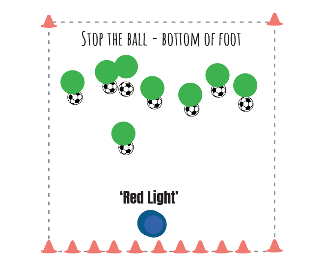 The instructor shouts, "Red Light!" All students must immediately stop and freeze in place with their ball.