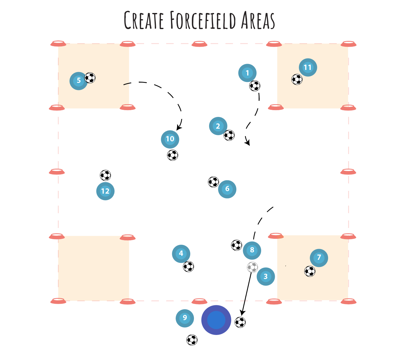 Forcefields: Create safe zones (mark them with cones or something similar) where players can dribble their ball in and be protected from having it kicked out for 10 seconds.