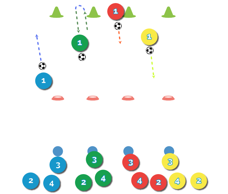 Tag In: Once they score, they get the ball, dribble back to the start and pass the ball to the next teammate.