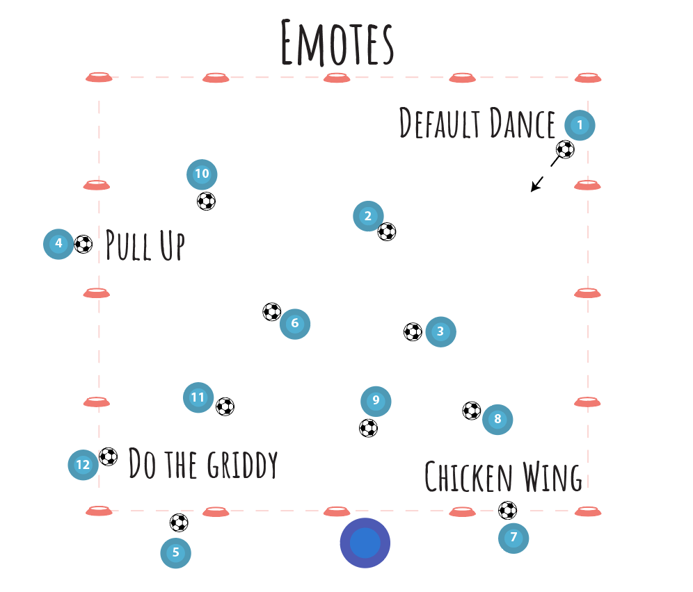 Fortnite Dance Comeback: If your ball gets knocked out, you can get back in the game by doing a Fortnite dance of your choice! (Examples: Pull Up, Default Dance, Do the Griddy, Chicken Wing).