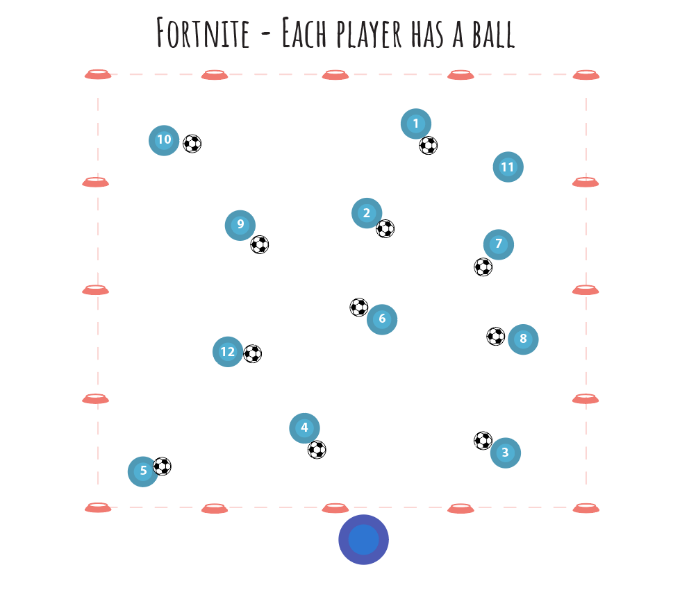 Time to unleash the Fortnite Bots! Pick a few players who will be the Bots. They don't get a ball, but they can use their feet to kick other players' balls out of bounds. Watch out!