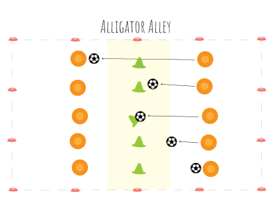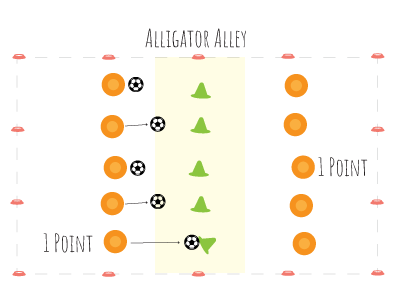 Players try to kick or "strike" their ball so it hits and knocks over the cone feet (the alligator head).