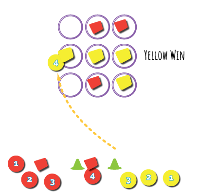 Both teams must line up some distance from the hula hoops at a starting line. When the coach says “GO,” player one from the first team runs to the hula hoops, drops a beanbag into the hoop of their choice, and then runs back as quickly as possible. As soon as that player returns, player one from the second team does the same, running to the hoops and dropping a beanbag into another hoop, attempting to block the other team from winning (just like in regular tic-tac-toe).